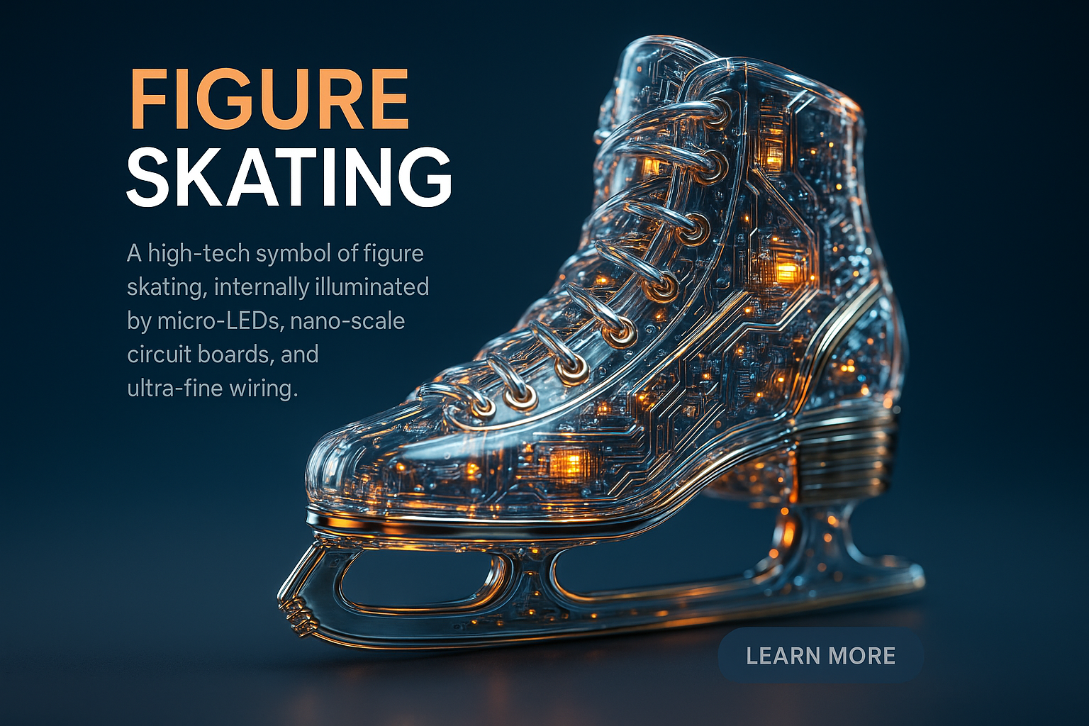 /Collection: /by davooda/Type: PNG/An ultra-detailed figure skating skate design, showcasing a glass-like surface filled with glowing micro-LEDs and intricate mechanical components, set against a soft gradient background.
