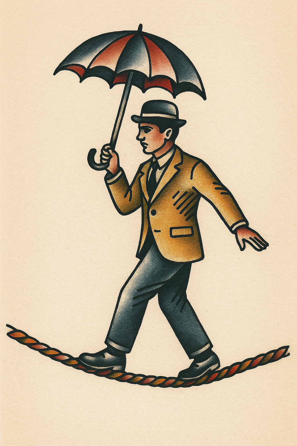/Collection: /by davooda/Type: PNG/A stylized illustration of a tightrope walker gripping an umbrella, dressed in vintage attire, set against a light beige background. The artwork features bold colors and classic tattoo design elements.