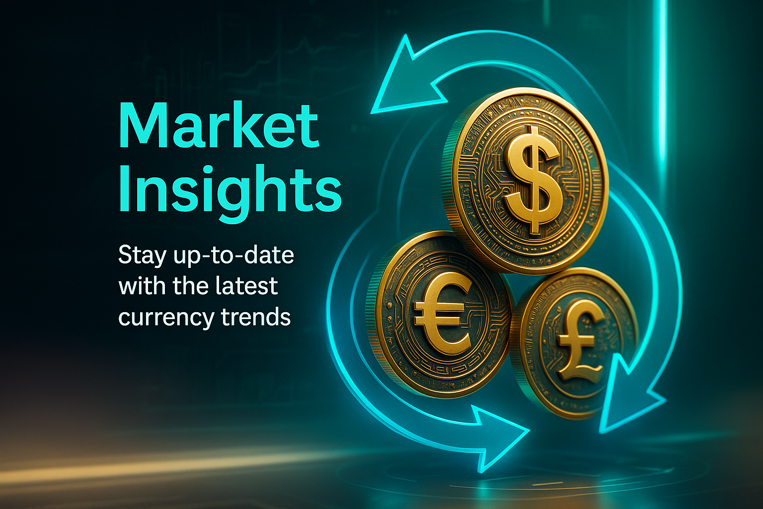 Modern digital graphic showcasing 3D currency coins surrounded by dynamic arrows, representing market insights and trends in currency exchange. Ideal for finance-related content.