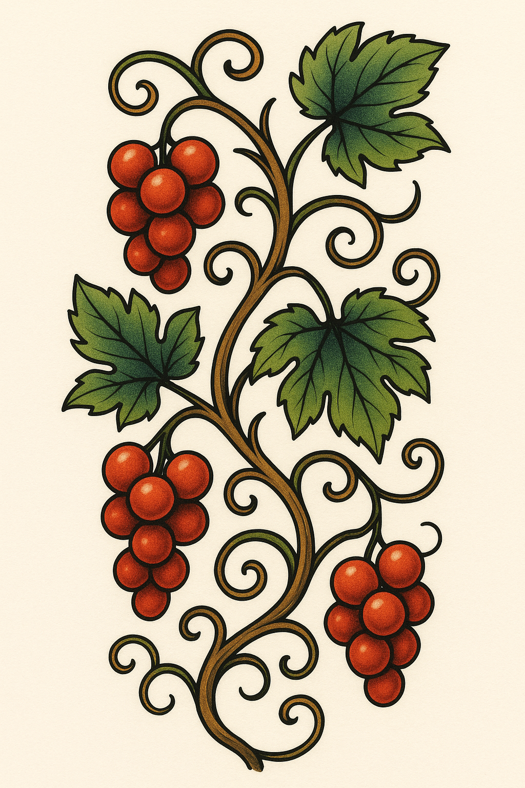 A decorative illustration of a grapevine featuring clusters of red grapes and green leaves, showcasing intricate line work and a vintage aesthetic, ideal for food and wine-related designs.