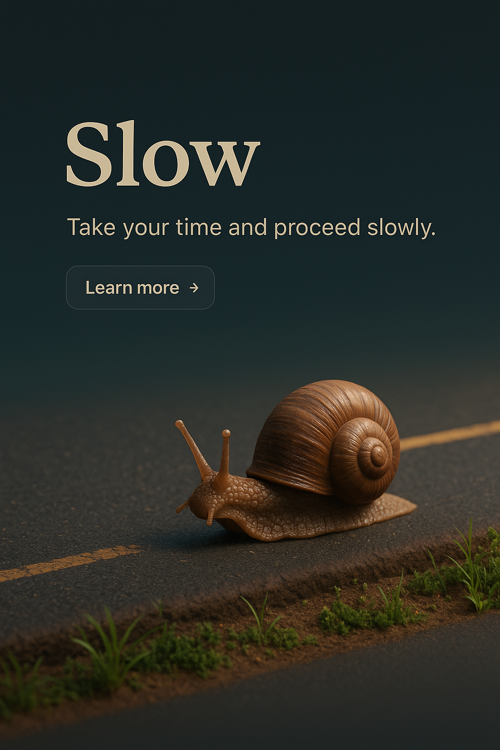 /Collection: /by davooda/Type: PNG/A detailed 3D illustration of a snail on a road, showcasing a dark gradient background. The scene emphasizes the theme of slowness with a clear call-to-action button.
