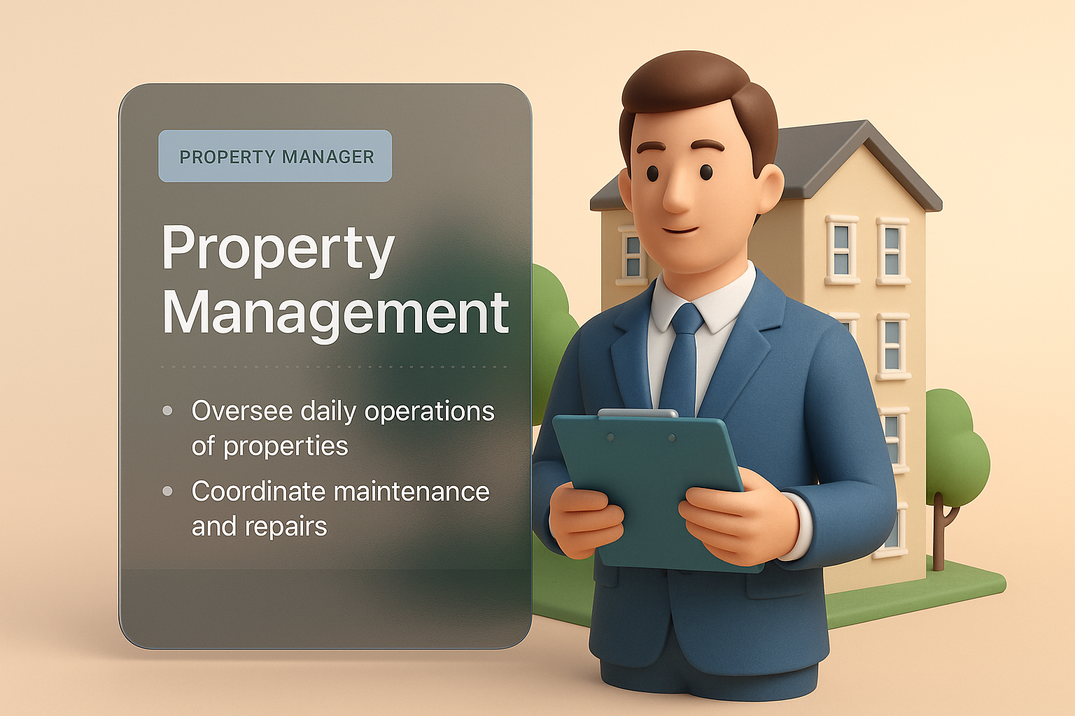 /Collection: /by davooda/Type: PNG/A 3D illustration featuring a property manager holding a clipboard, with a backdrop of a house. Two informative blocks provide concise descriptions, integrated with a soft gradient background.