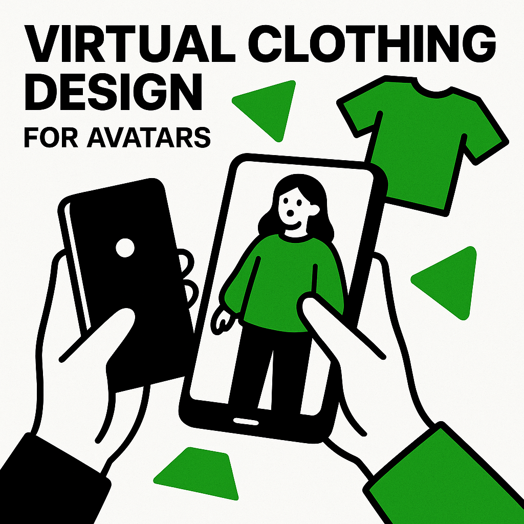/Collection: /by davooda/Type: PNG/Stylized graphic illustrating the concept of virtual clothing design for avatars, featuring hands holding a smartphone displaying an avatar in a green outfit. Ideal for tech and fashion-related content.