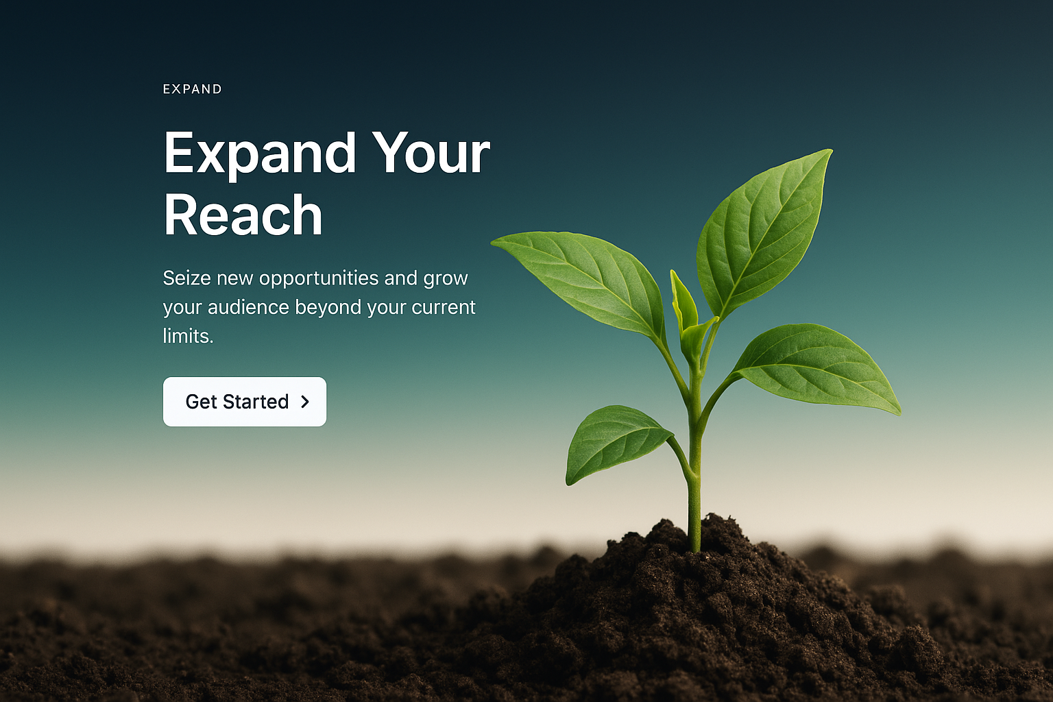 /Collection: /by davooda/Type: PNG/A stylish web page design featuring a seedling growing from soil with a gradient background. Includes a clear call-to-action button and concise text, emphasizing growth.