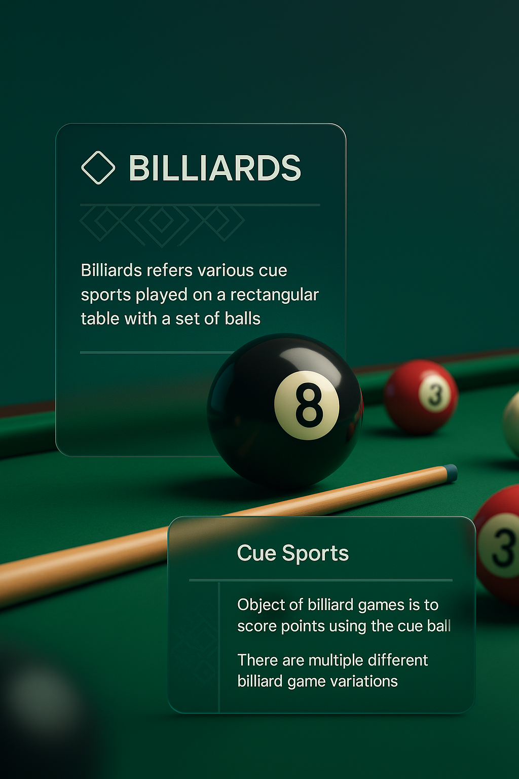 A modern web page design featuring a 3D billiards illustration. The layout includes blocks for information with a stylish overlay, ensuring text readability.