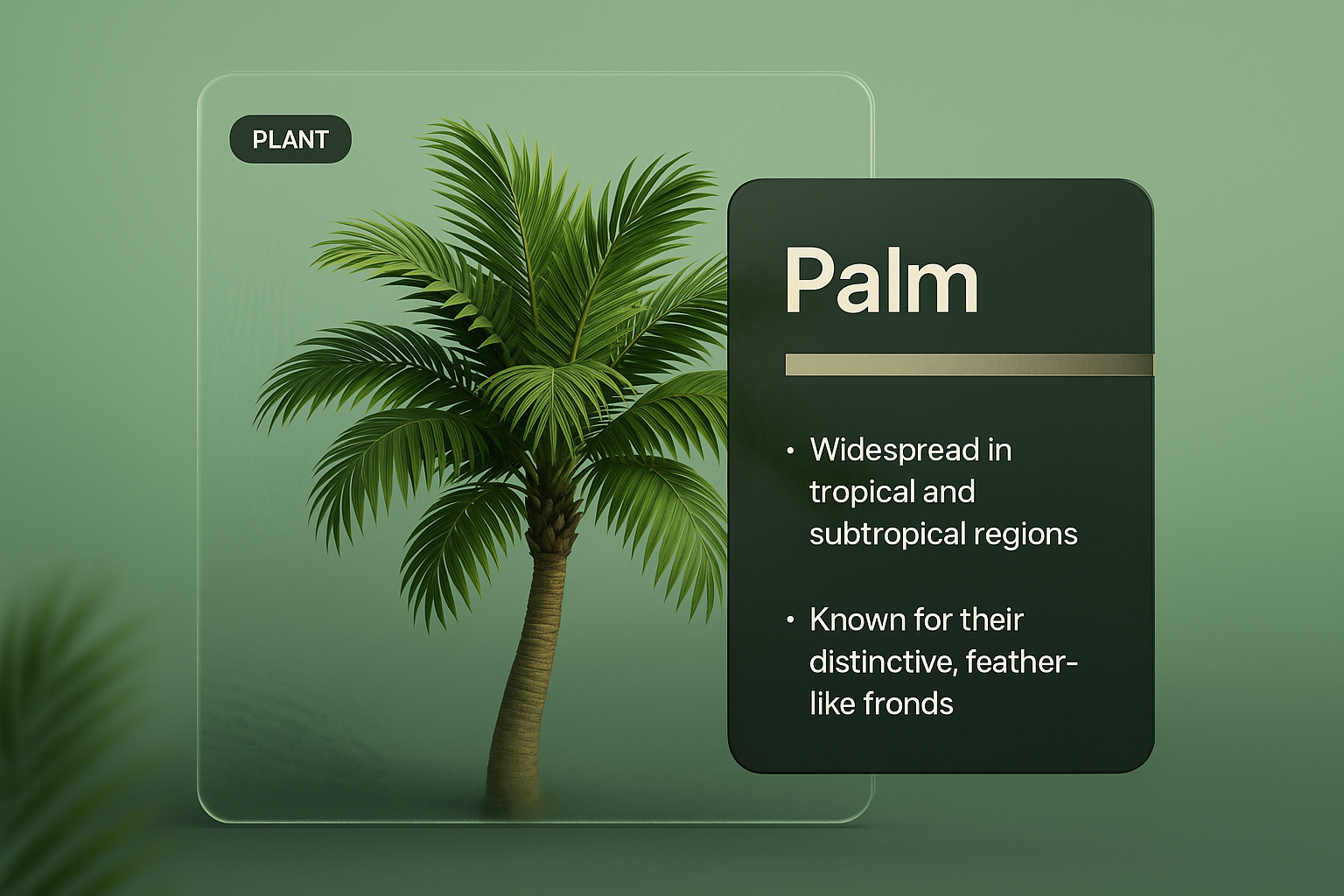 A visually appealing 3D illustration of a palm tree set against a smooth gradient background. The design features an informative overlay with a dark panel containing key details about the plant.