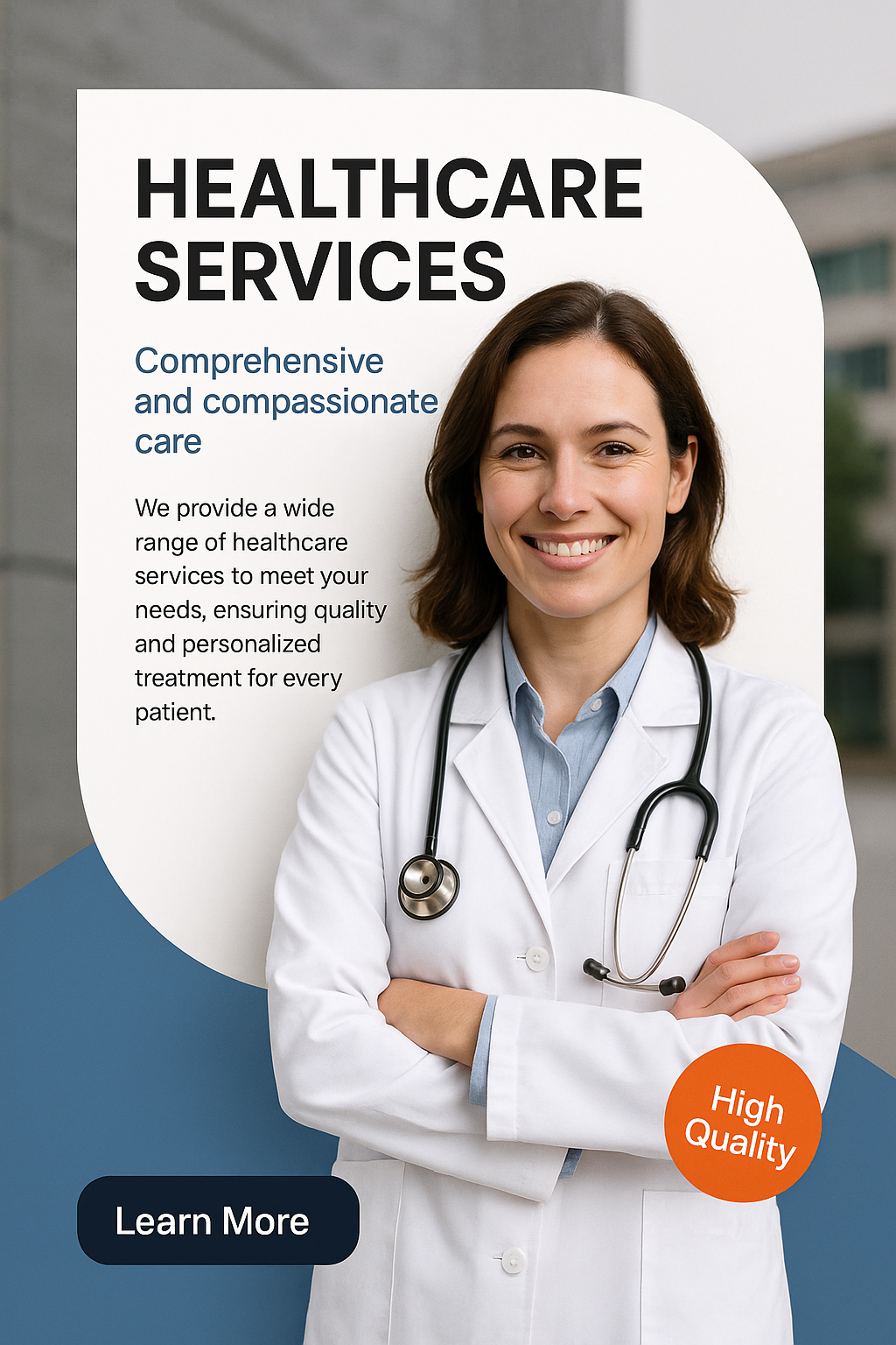/Collection: /by davooda/Type: PNG/A smiling female doctor stands confidently with arms crossed, wearing a white coat. The background features a professional setting. Text highlights healthcare services offered.
