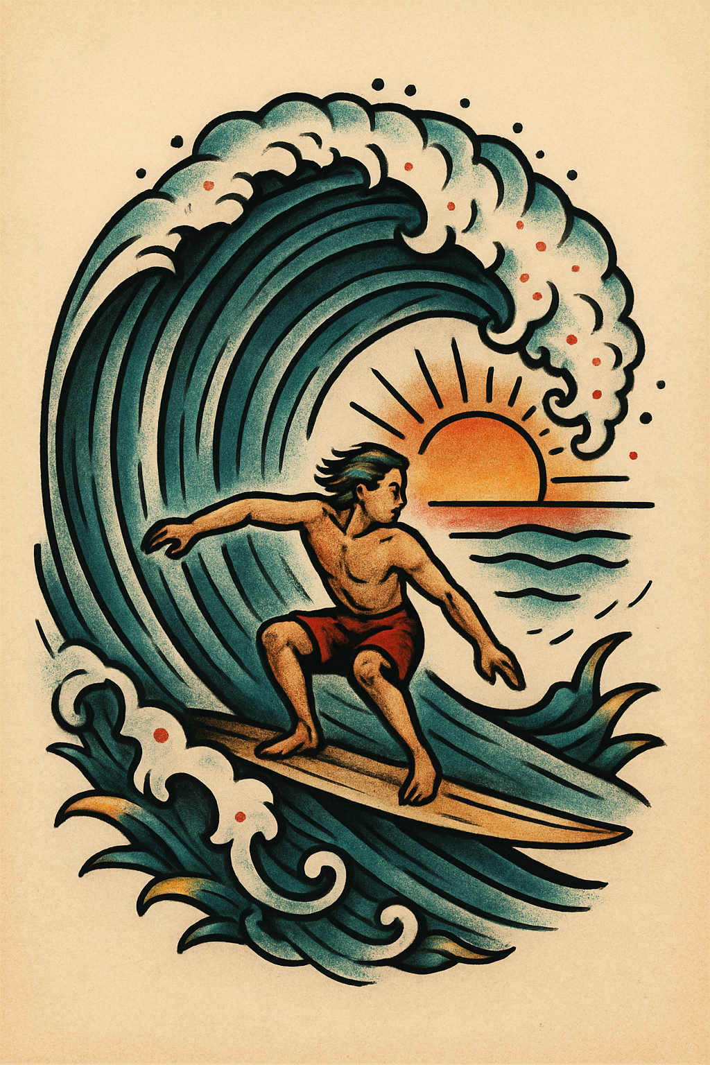 /Collection: /by davooda/Type: PNG/This image features a vintage-style illustration of a surfer riding a wave during sunset. The design combines bold colors and dynamic lines, ideal for surf culture enthusiasts.