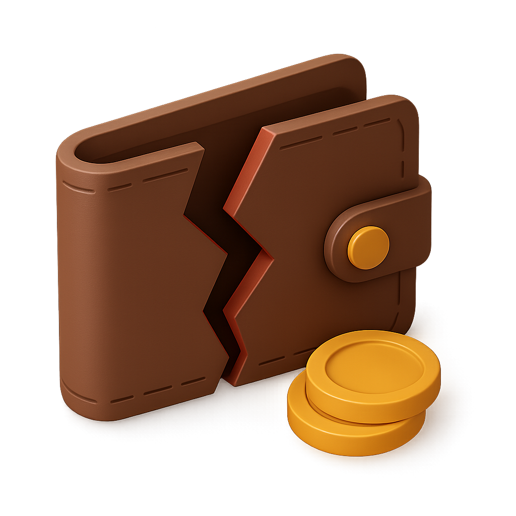 A stylized 3D icon of a broken wallet in a three-quarter view, featuring a visible crack and two golden coins beside it, set against a dark background.