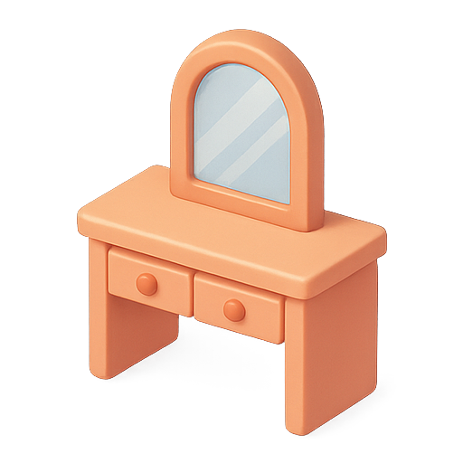 A 3D illustration of a modern vanity table featuring a mirror and two drawers, designed in a soft orange color. Ideal for interior design concepts or home decor inspiration.