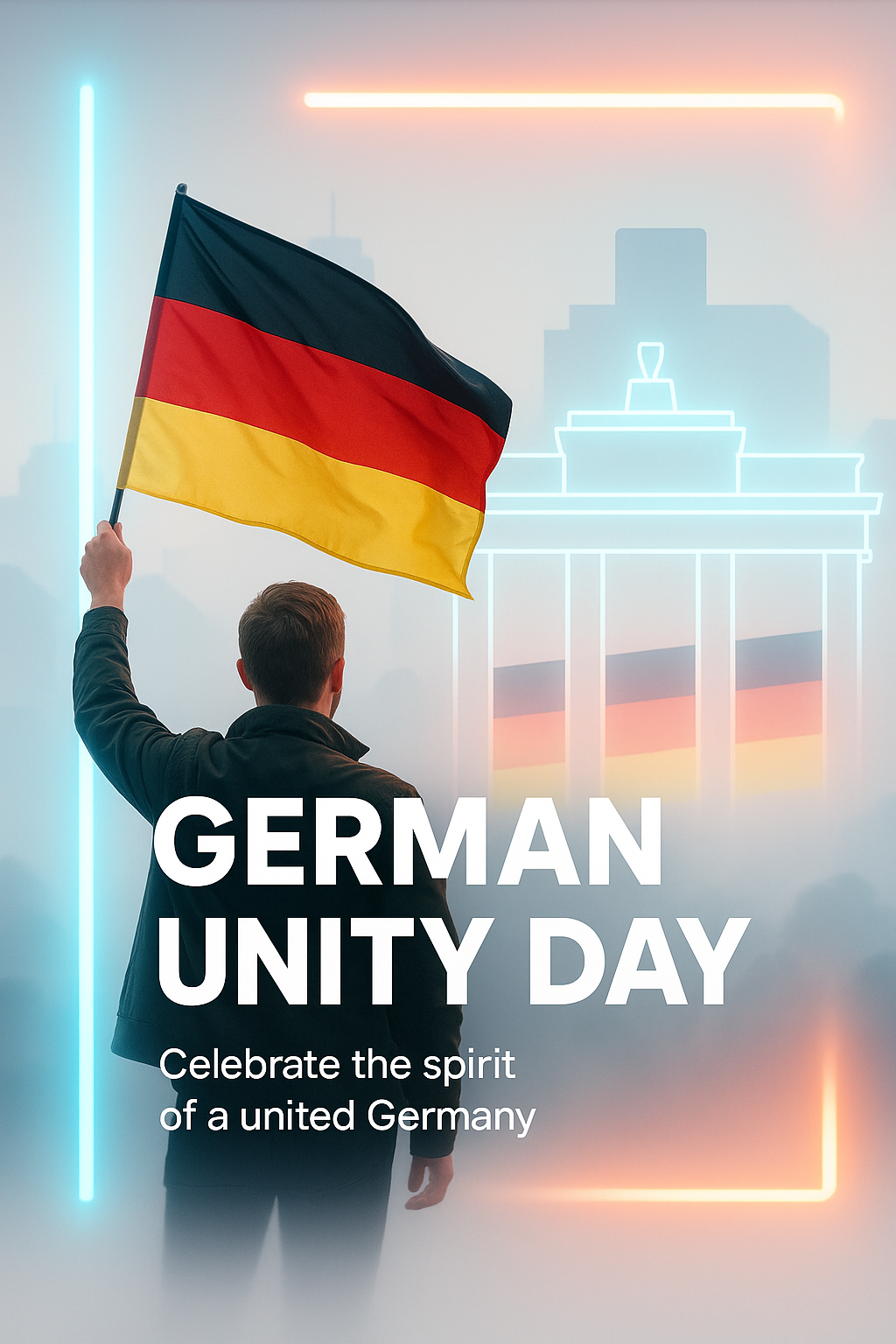 A vibrant graphic celebrating German Unity Day, featuring a silhouetted figure holding the German flag against a stylized backdrop of a famous German landmark, ideal for social media or event promotions.