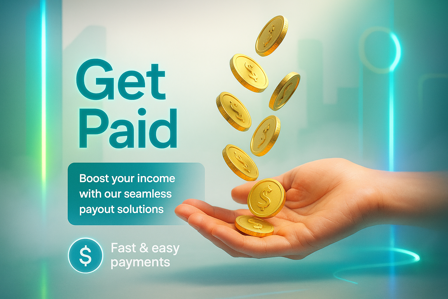 /Collection: /by davooda/Type: PNG/Vibrant promotional graphic showcasing a hand receiving floating coins, symbolizing financial services. Ideal for marketing campaigns focused on income and payment solutions.