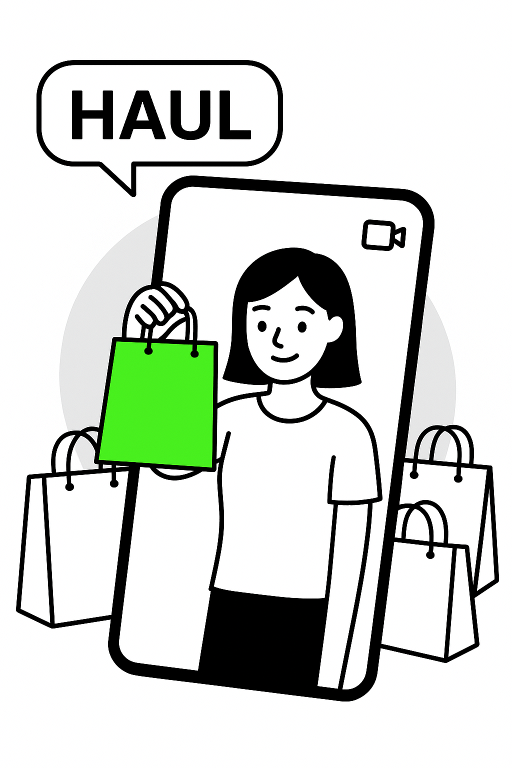 /Collection: /by davooda/Type: PNG/A minimalist graphic featuring a person holding shopping bags in front of a smartphone, ideal for social media or marketing content related to shopping and haul videos.