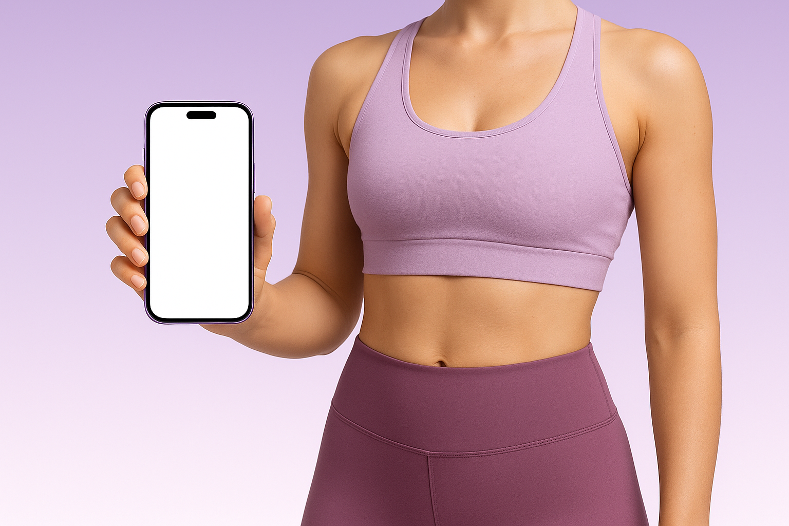 /Collection: /by davooda/Type: PNG/A female fitness trainer in a purple crop top and leggings holds a smartphone with a blank screen. The background features a smooth gradient from purple to white.