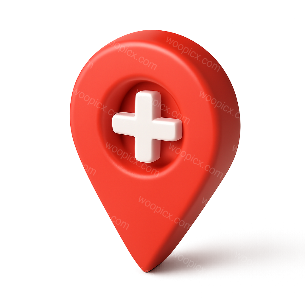 This image features a sleek 3D location marker in red, showcasing a white plus sign at its center. The design has a soft, volumetric feel with a three-quarter view and a transparent background.