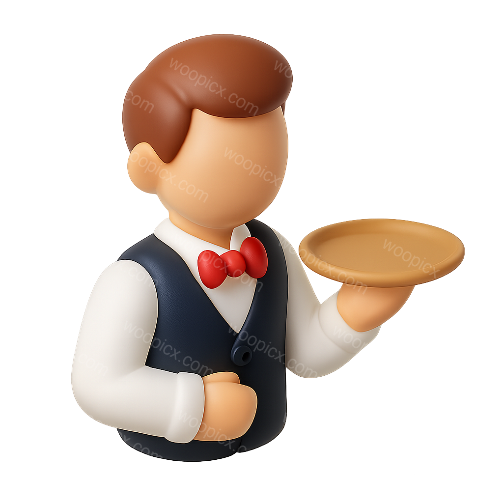 /Premium/Collection: /by davooda/Type: PNG/A minimalist 3D icon depicting a waiter holding a tray, designed in a three-quarter isometric view. The character features a bow tie and a vest, set against a soft gradient background.