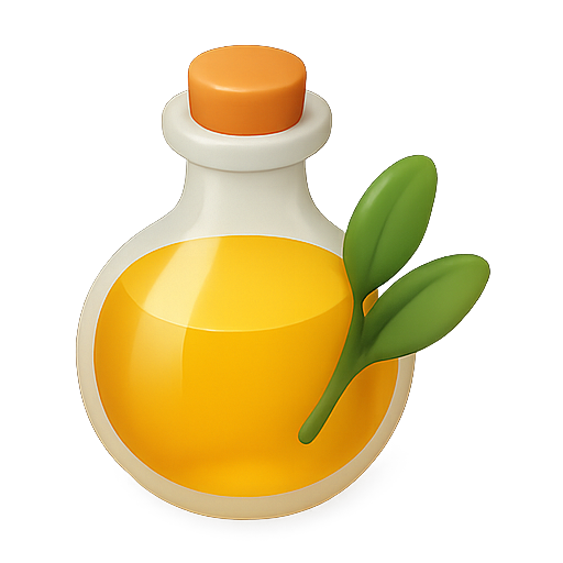 A colorful and modern icon of an oil bottle featuring a vibrant yellow liquid and green leaves. Ideal for culinary, health, or wellness applications.