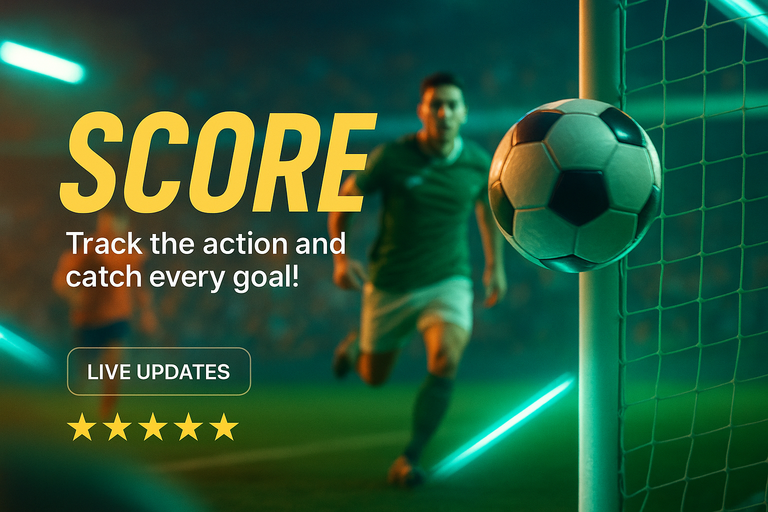 A vibrant soccer scene featuring a player in motion, neon accents, and a bold score overlay. The design captures the excitement of live updates with glowing elements.