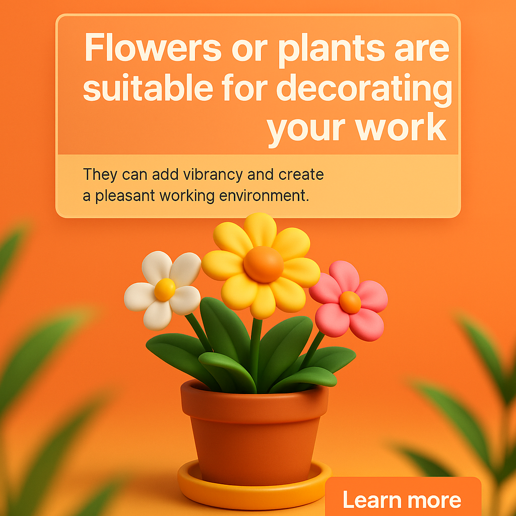 Colorful 3D illustration of a flower pot with vibrant flowers, designed to enhance workspace aesthetics. Ideal for articles or posts about office decoration.