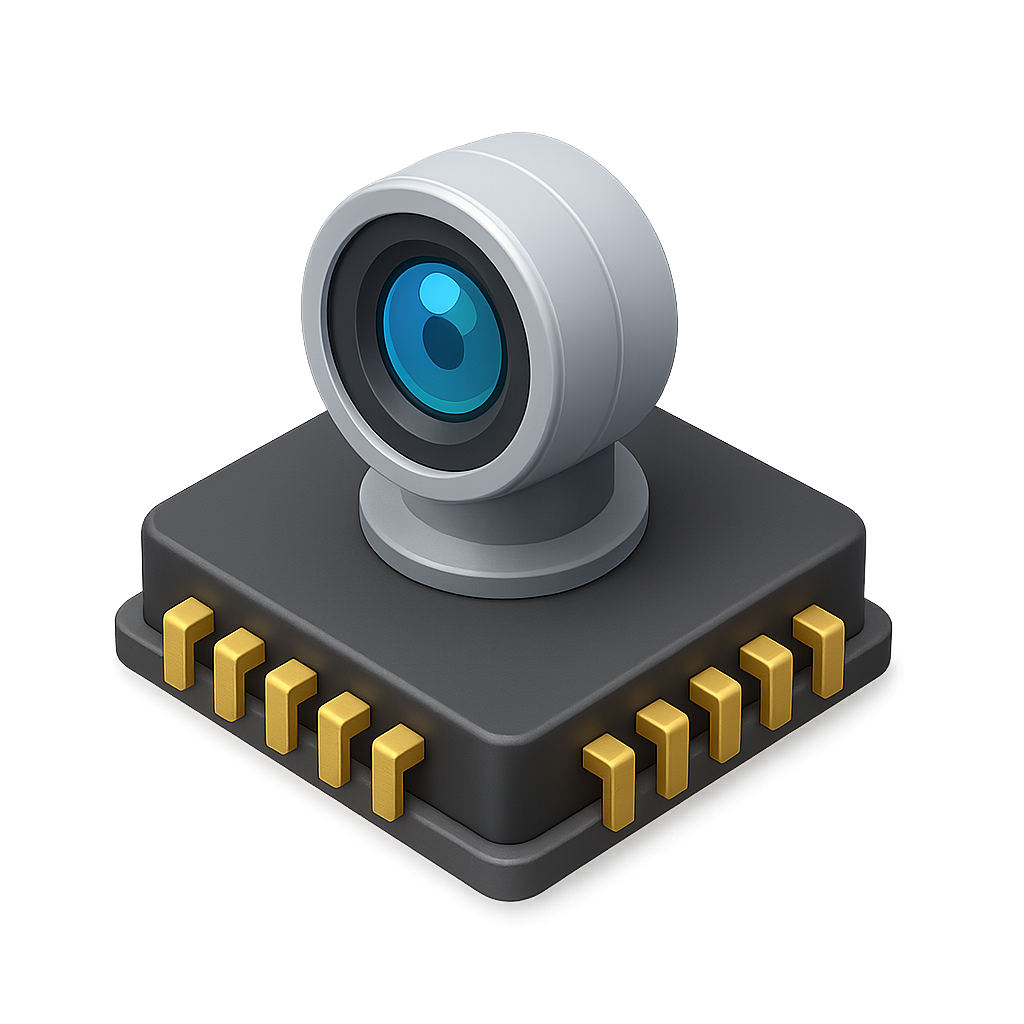 A visually engaging 3D icon of a signal processor, featuring a sleek design with a camera lens and gold connectors, rendered in an isometric perspective.