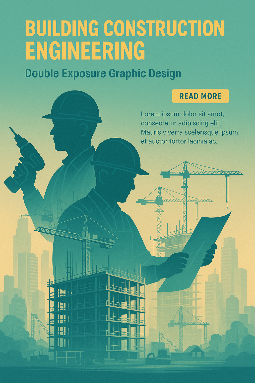 /Collection: /by davooda/Type: PNG/A visually striking double exposure graphic design representing building construction engineering. Ideal for promotional materials or educational content in the architecture and engineering sectors.