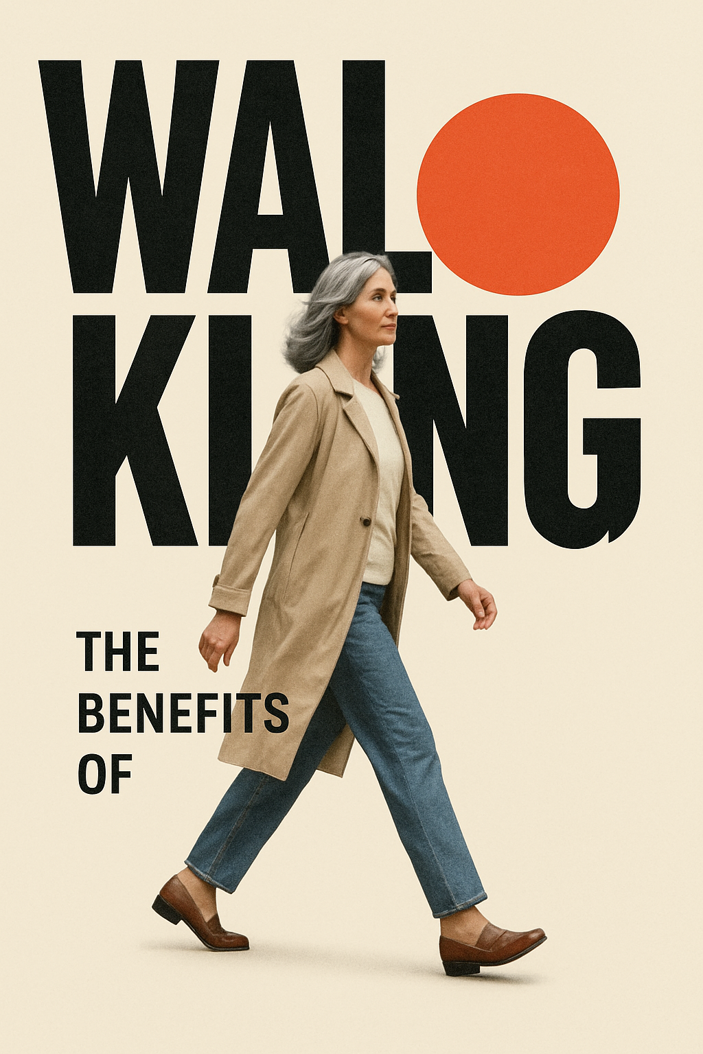 /Collection: , /by davooda/Type: PNG/Stylish promotional graphic illustrating the benefits of walking, featuring a woman in motion against a minimalist background. Ideal for wellness campaigns and fitness initiatives.