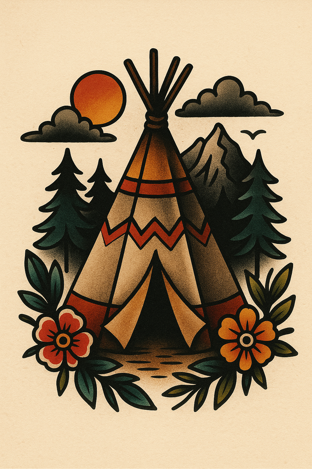 Colorful traditional teepee illustration with nature elements