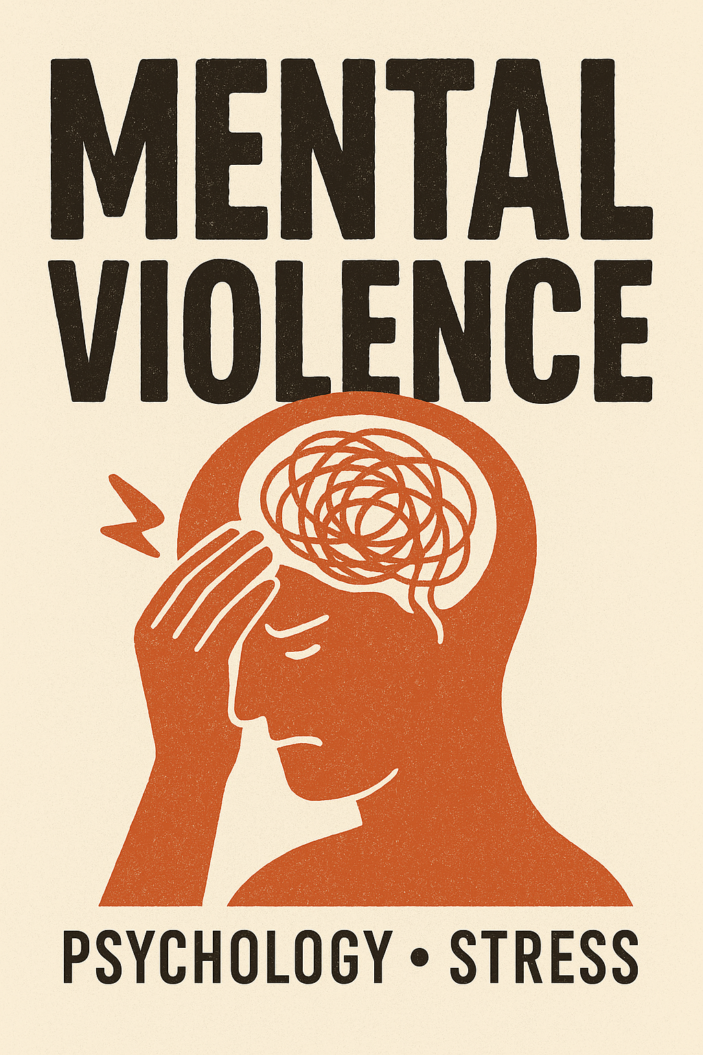 This graphic represents the themes of mental violence and stress, using a stylized illustration of a person in distress. Suitable for educational campaigns or mental health awareness.