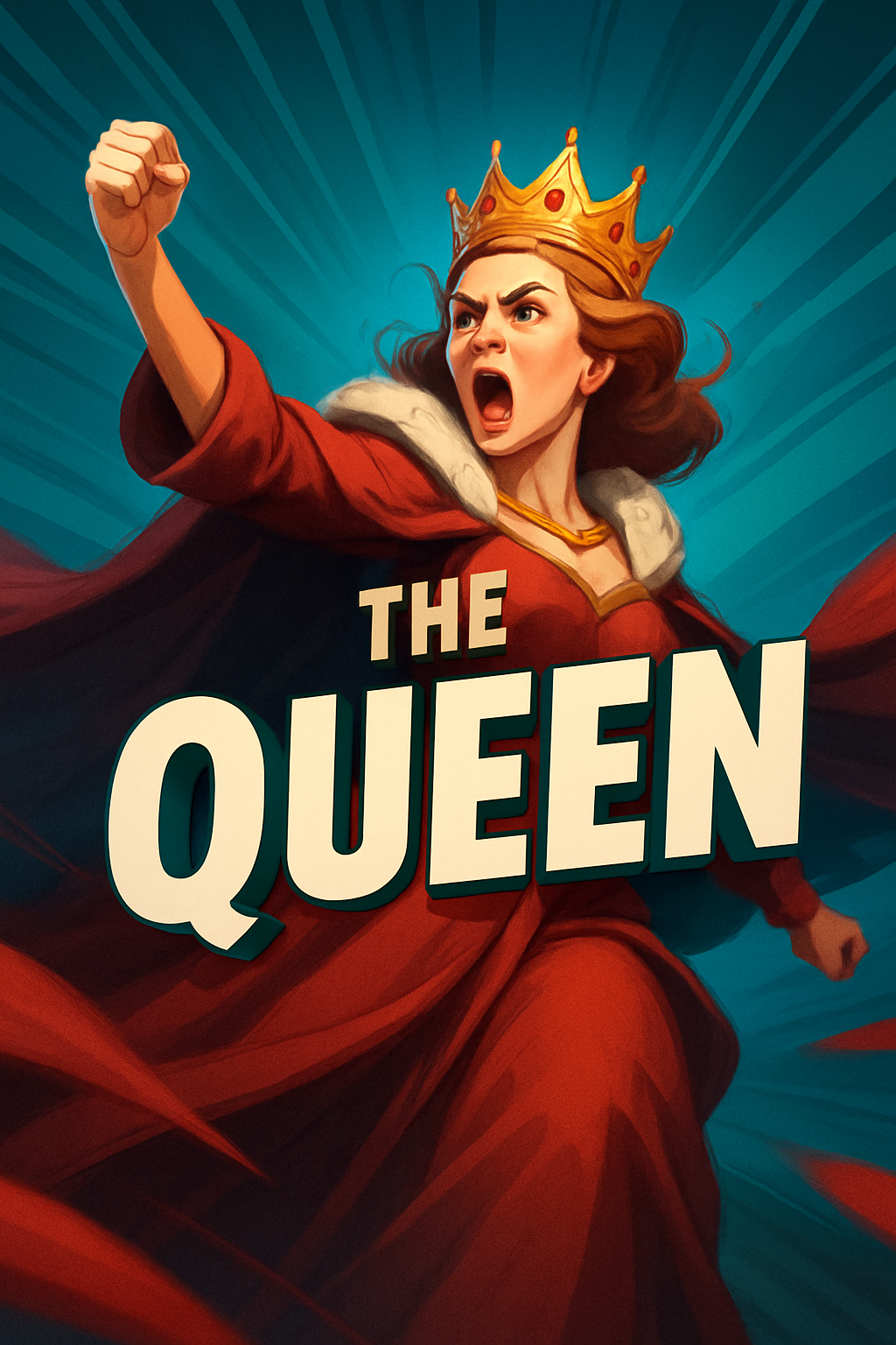 A fierce queen in a dramatic pose, wearing a crown and a regal red cloak. Her expression conveys strength and determination, set against a dynamic burst of colors.