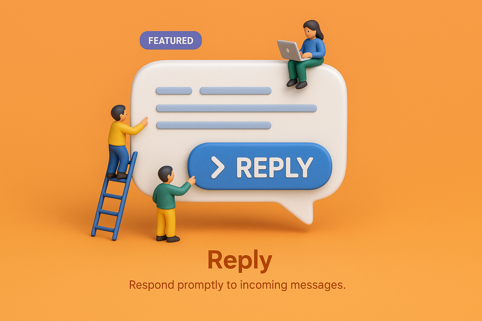 /Collection: /by davooda/Type: PNG/A vibrant 3D illustration depicting small characters interacting with a messaging interface. The scene features a colorful background and emphasizes a 'Reply' action button.