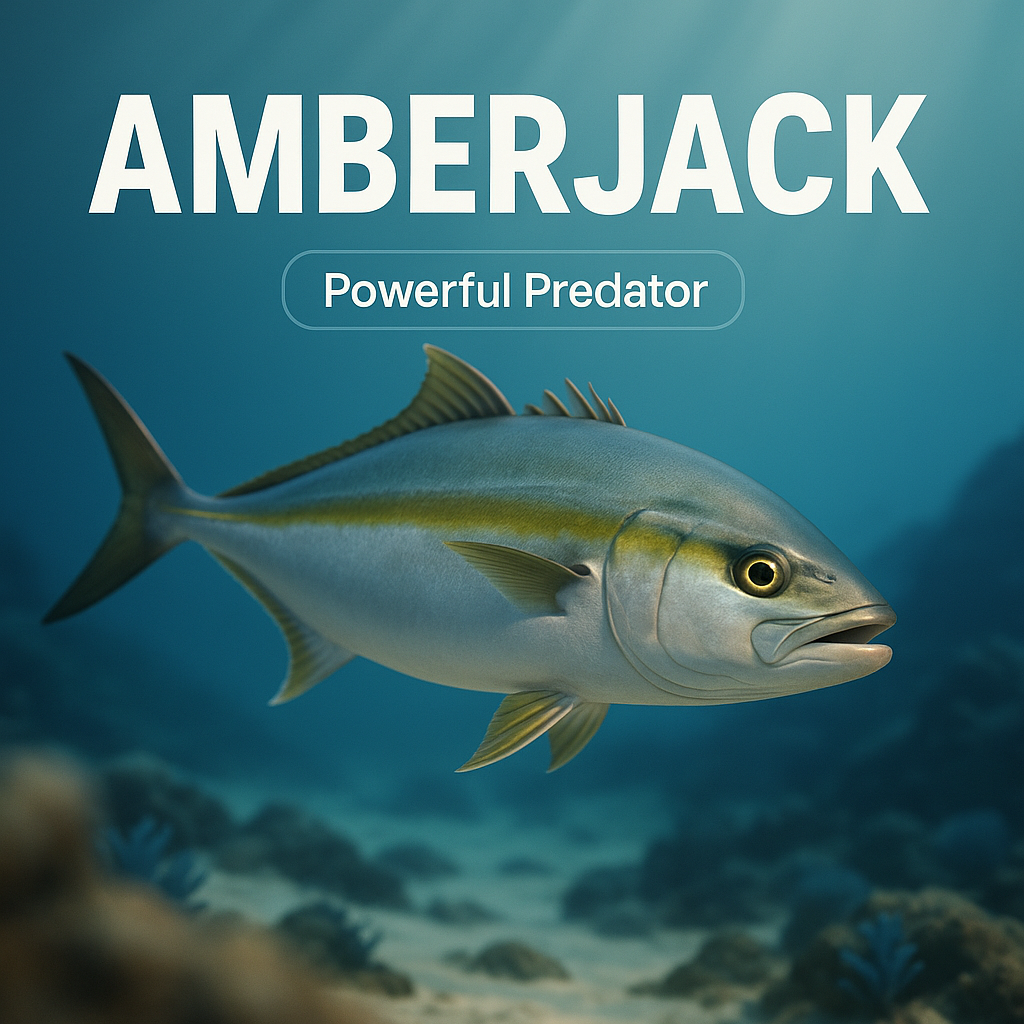 /Collection: /by davooda/Type: PNG/A captivating 3D illustration of an Amberjack fish swimming in a serene underwater environment, featuring clear, bold text that emphasizes its powerful nature.