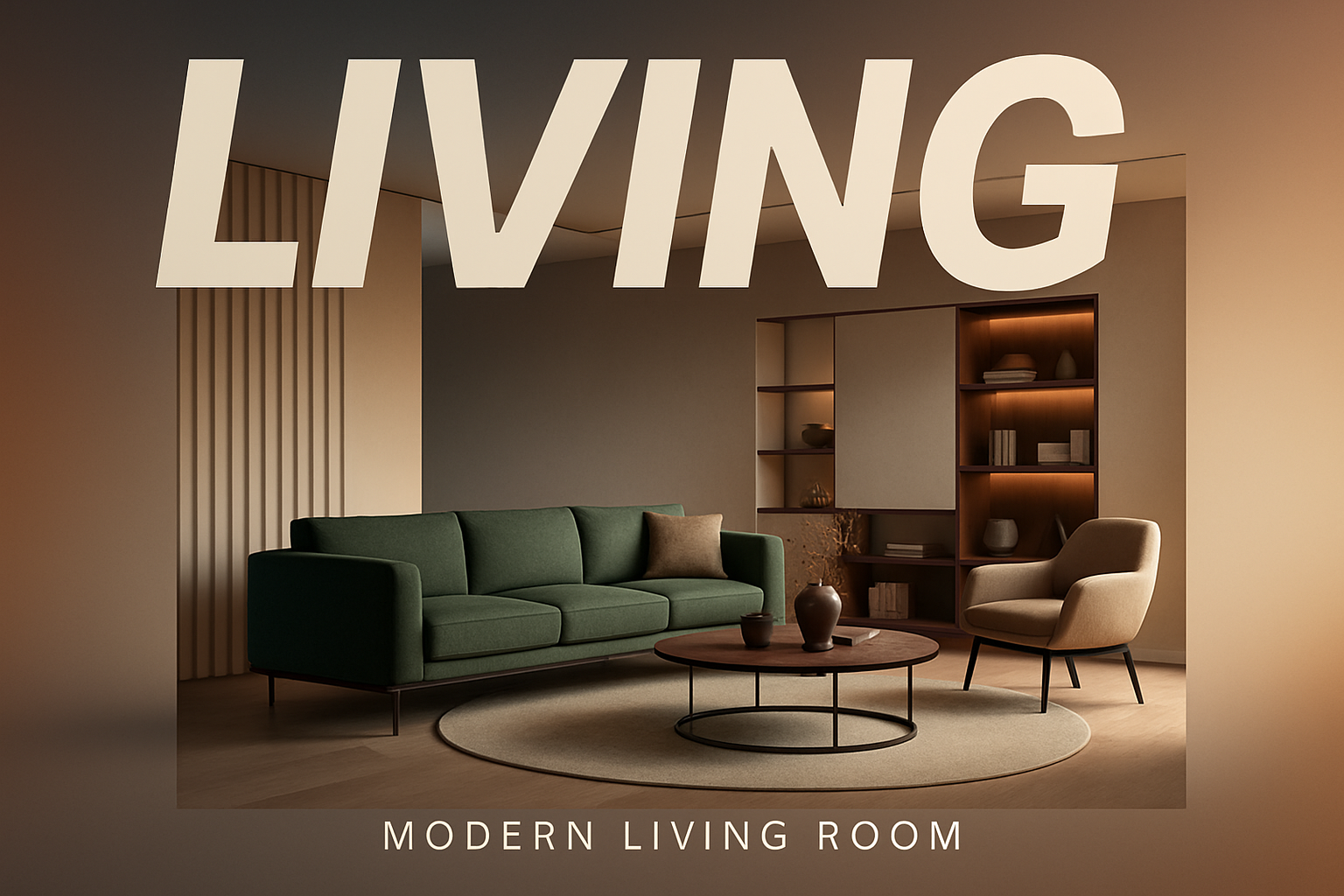 /Collection: /by davooda/Type: PNG/A spacious modern living room featuring a green sofa, stylish armchairs, and a round coffee table on a decorative carpet. The background showcases a sleek shelf and a color gradient with soft lighting, enhancing the energetic atmosphere.