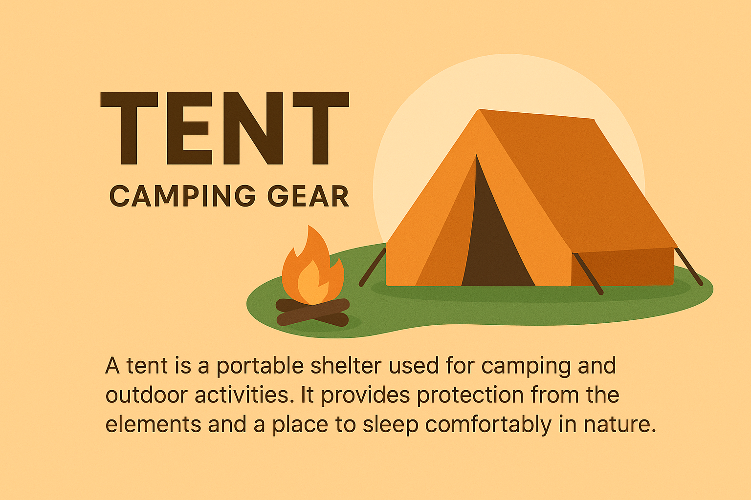 A visually appealing illustration of a tent set against a simple gradient background, emphasizing camping gear and outdoor activities. The design includes a campfire and clear text elements.