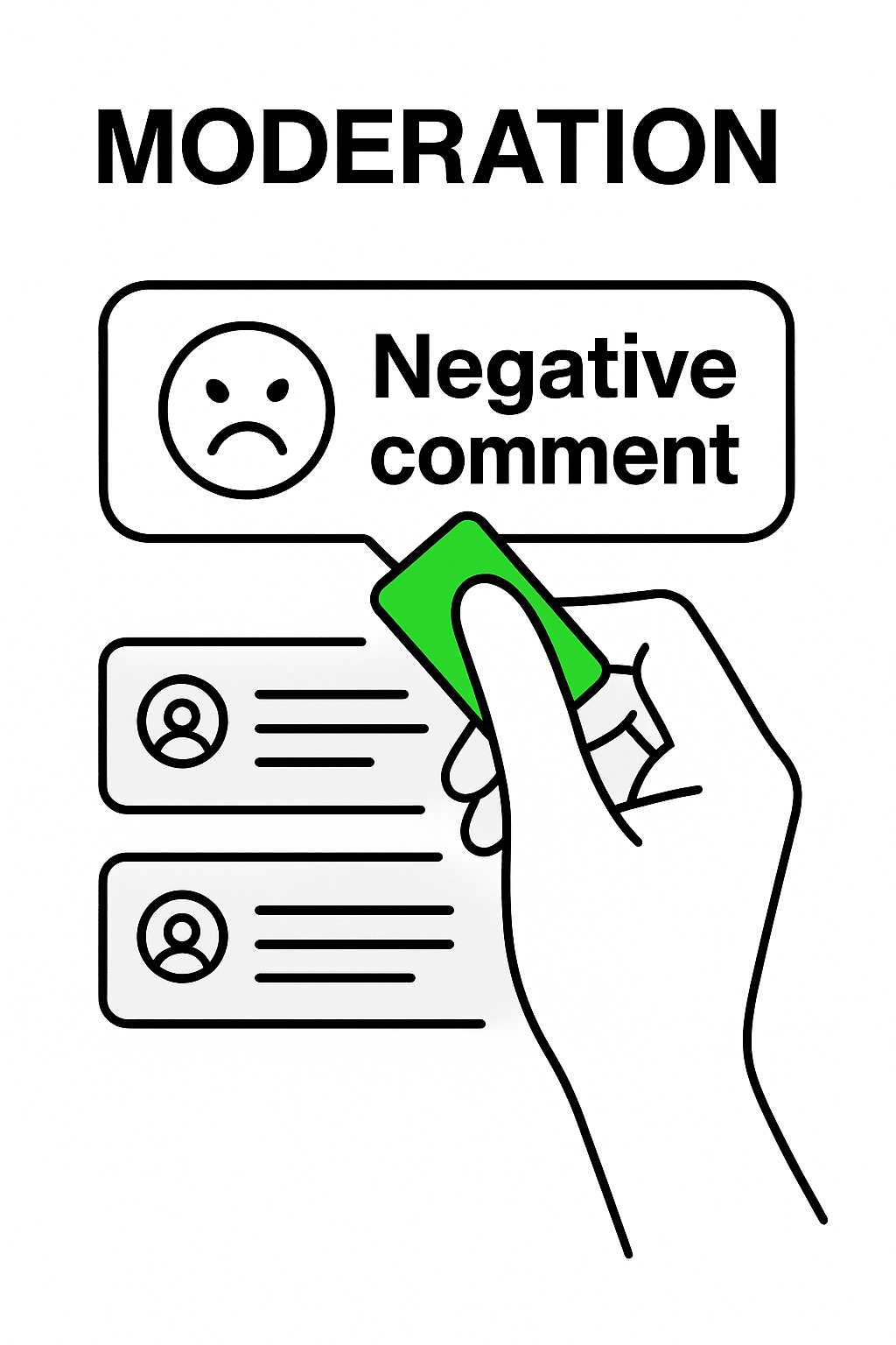 A simple line art illustration depicting the process of moderating negative comments online. The hand is shown erasing a negative comment, suitable for digital communication platforms.