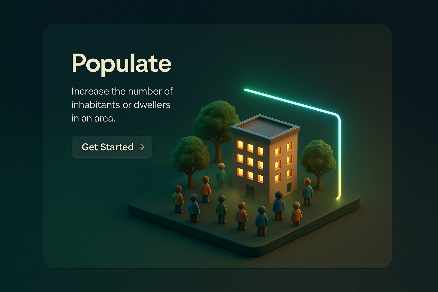 A visually striking 3D scene depicting a small community with glowing neon accents. The buildings and figures are surrounded by a misty atmosphere, enhancing the vibrant colors.
