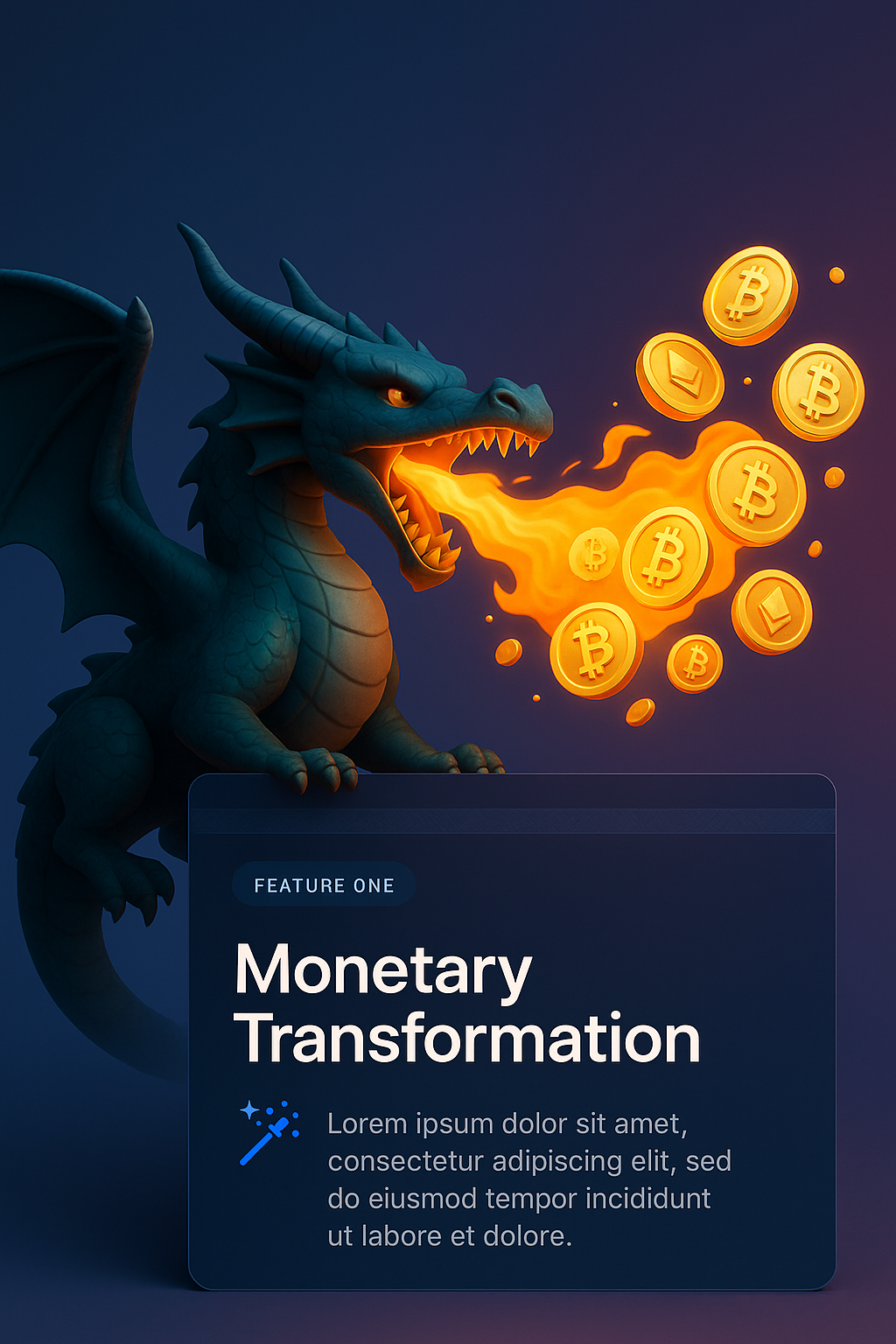 A vibrant 3D illustration of a dragon exhaling flames that morph into cryptocurrency coins, set against a smooth gradient background.