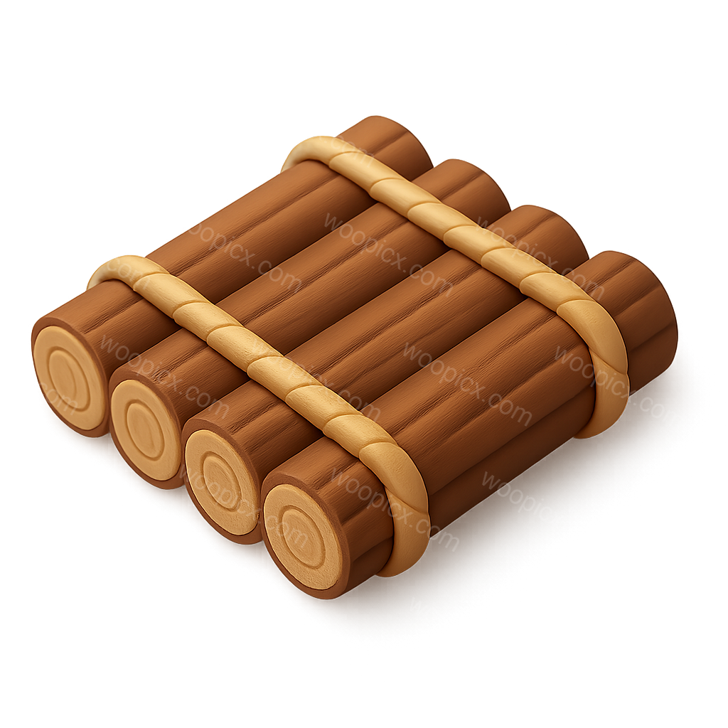 /Premium/Collection: /by davooda/Type: PNG/A visually appealing 3D representation of a wooden raft made from logs, featuring a transparent background and isometric perspective. The raft is tied with a yellowish rope, highlighting its volumetric design.