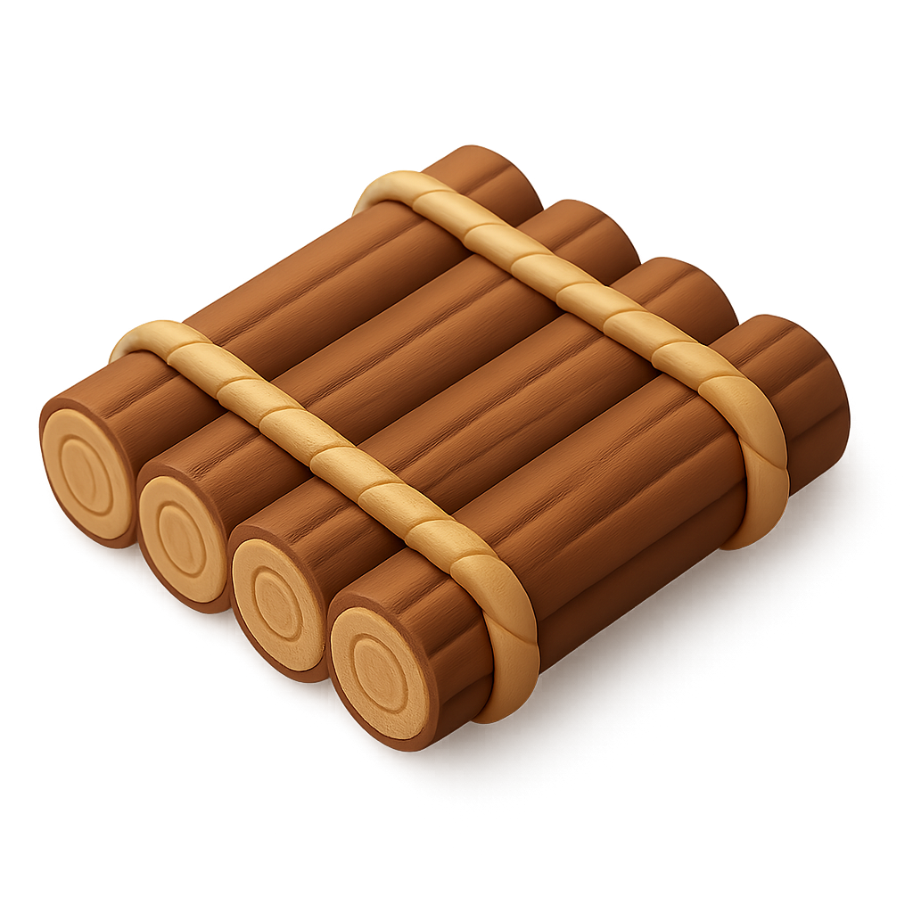 A visually appealing 3D representation of a wooden raft made from logs, featuring a transparent background and isometric perspective. The raft is tied with a yellowish rope, highlighting its volumetric design.