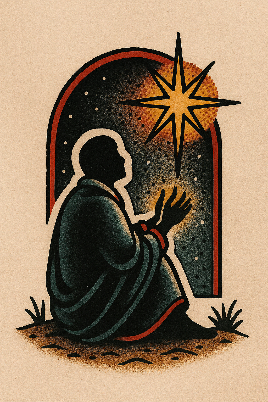 The image depicts a silhouette of a figure in a praying pose, reaching towards a bright star. The design features a classic tattoo style with multiple colors against a light beige background.