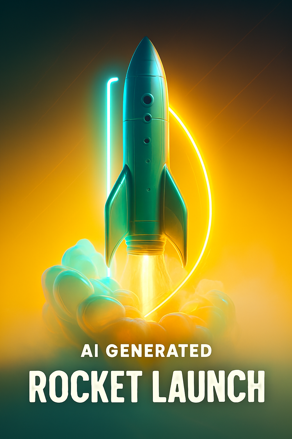 A vibrant, AI-generated image of a rocket launch illuminated by neon lights. The rocket is central, surrounded by colorful, translucent clouds and beams of light, creating a captivating aura.
