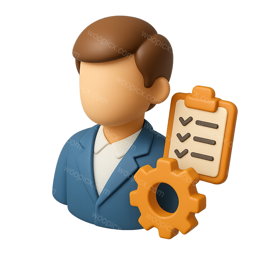 /Premium/Collection: /by davooda/Type: PNG/This image features a 3D icon representing a product manager, depicted in a three-quarter view. The figure is wearing a blue suit, accompanied by a checklist and a gear symbol, emphasizing management and planning.