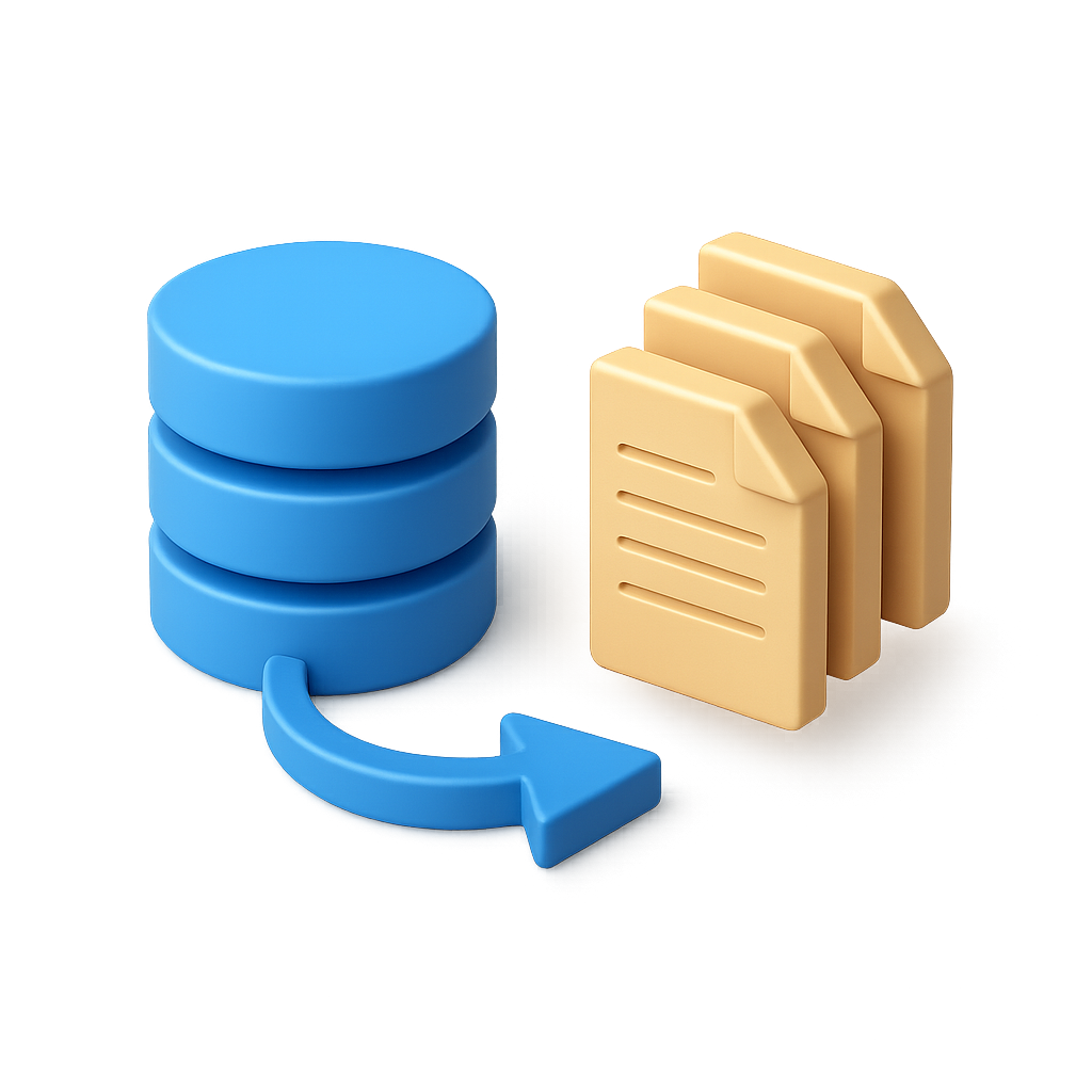 /Collection: /by davooda/Type: PNG/A visually appealing 3D icon depicting batch processing, featuring a blue database and yellow file stack with an arrow indicating data flow. The design has a transparent background and is presented in a three-quarter isometric view.