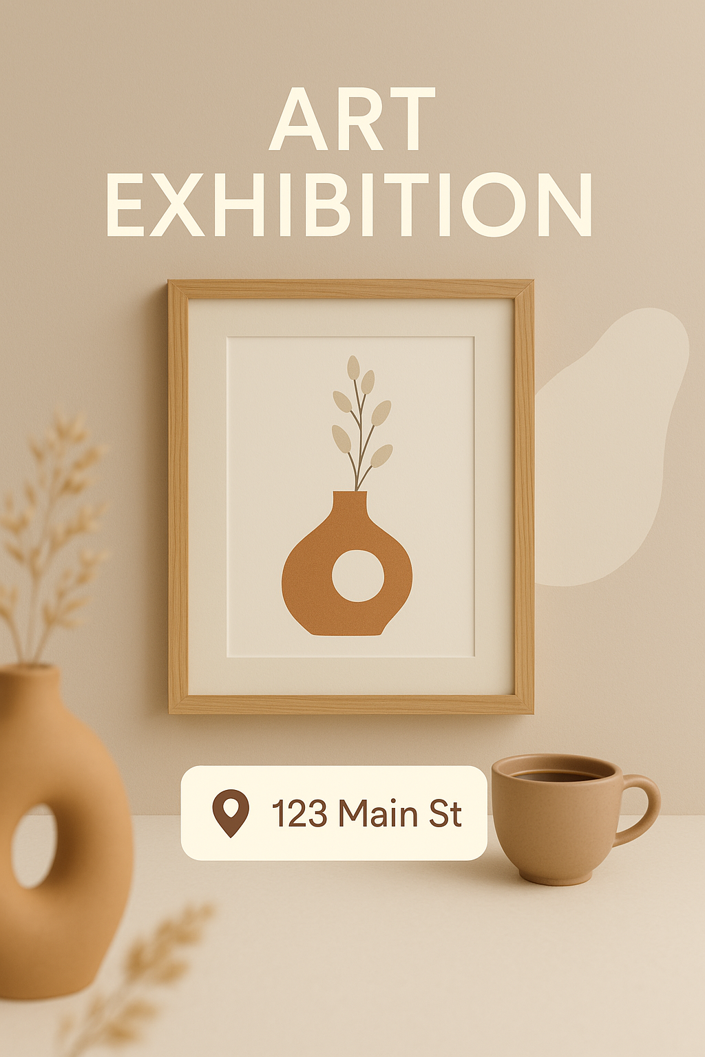 /Collection: /by davooda/Type: PNG/Elegant promotional graphic for an art exhibition, showcasing a minimalist design with a vase illustration. Ideal for event marketing and social media sharing.
