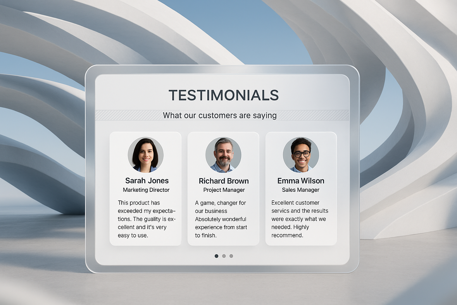 /Collection: /by davooda/Type: PNG/This image features a sleek, futuristic 3D architecture backdrop with three testimonial cards. Each card showcases a circular author photo, name, position, and testimonial text, all elegantly integrated into the design.
