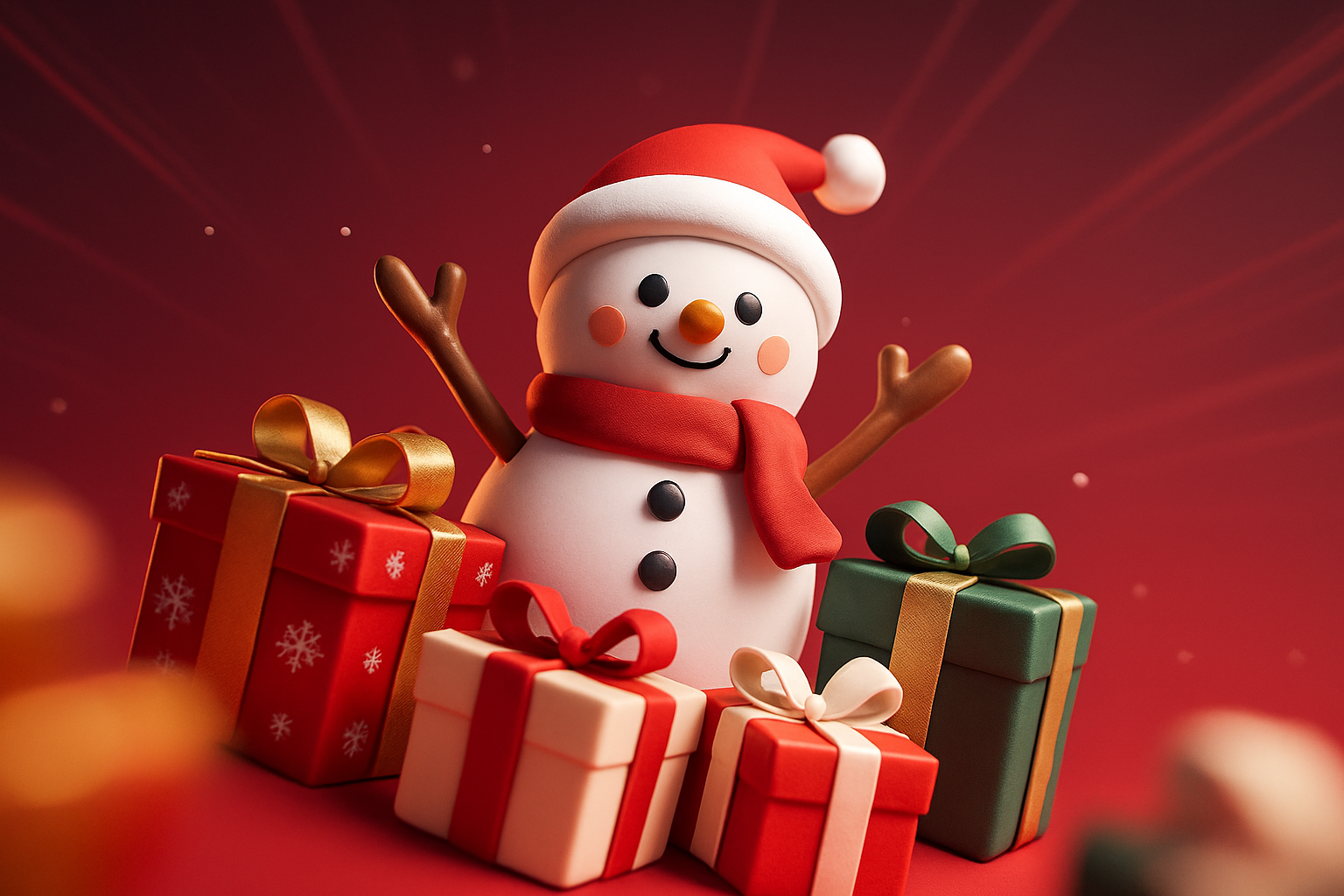 A delightful 3D illustration of a smiling snowman wearing a red hat and scarf, surrounded by colorful Christmas gifts. The background features a dynamic red gradient, enhancing the festive atmosphere.