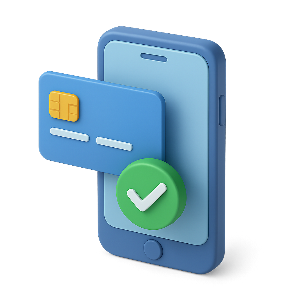 A vibrant 3D icon depicting a mobile phone with a credit card and a checkmark, showcasing a modern payment concept in an isometric view.