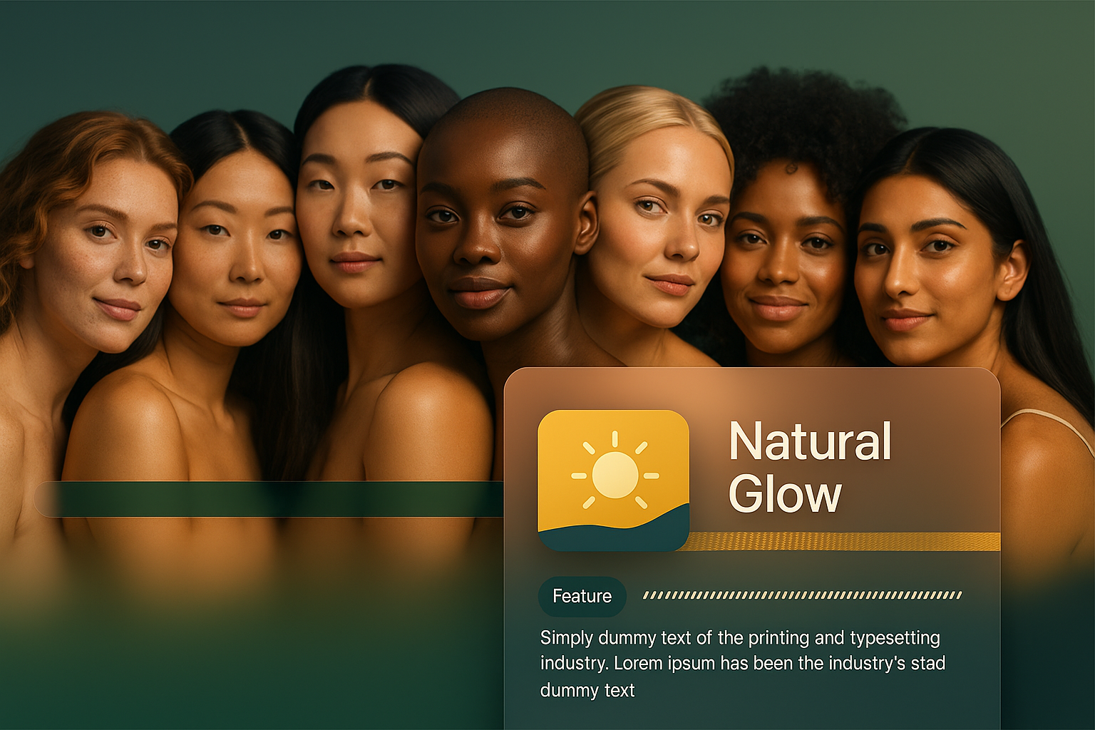 /Collection: /by davooda/Type: PNG/A portrait of a diverse group of beautiful women showcasing natural beauty and glowing skin. Each model represents different races and styles, emphasizing inclusivity.