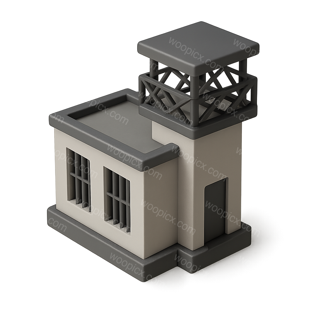 /Collection: /by davooda/Type: PNG/A simple 3D icon representing a prison facility, featuring a watchtower and a solid structure. Designed with a transparent background and a three-quarter isometric view.