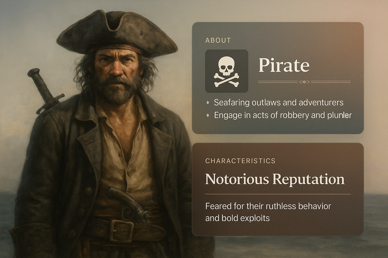 /Collection: /by davooda/Type: PNG/A visually engaging web page featuring a pirate illustration with two descriptive blocks integrated seamlessly into the design. The layout includes gradient backgrounds and clear text for readability.