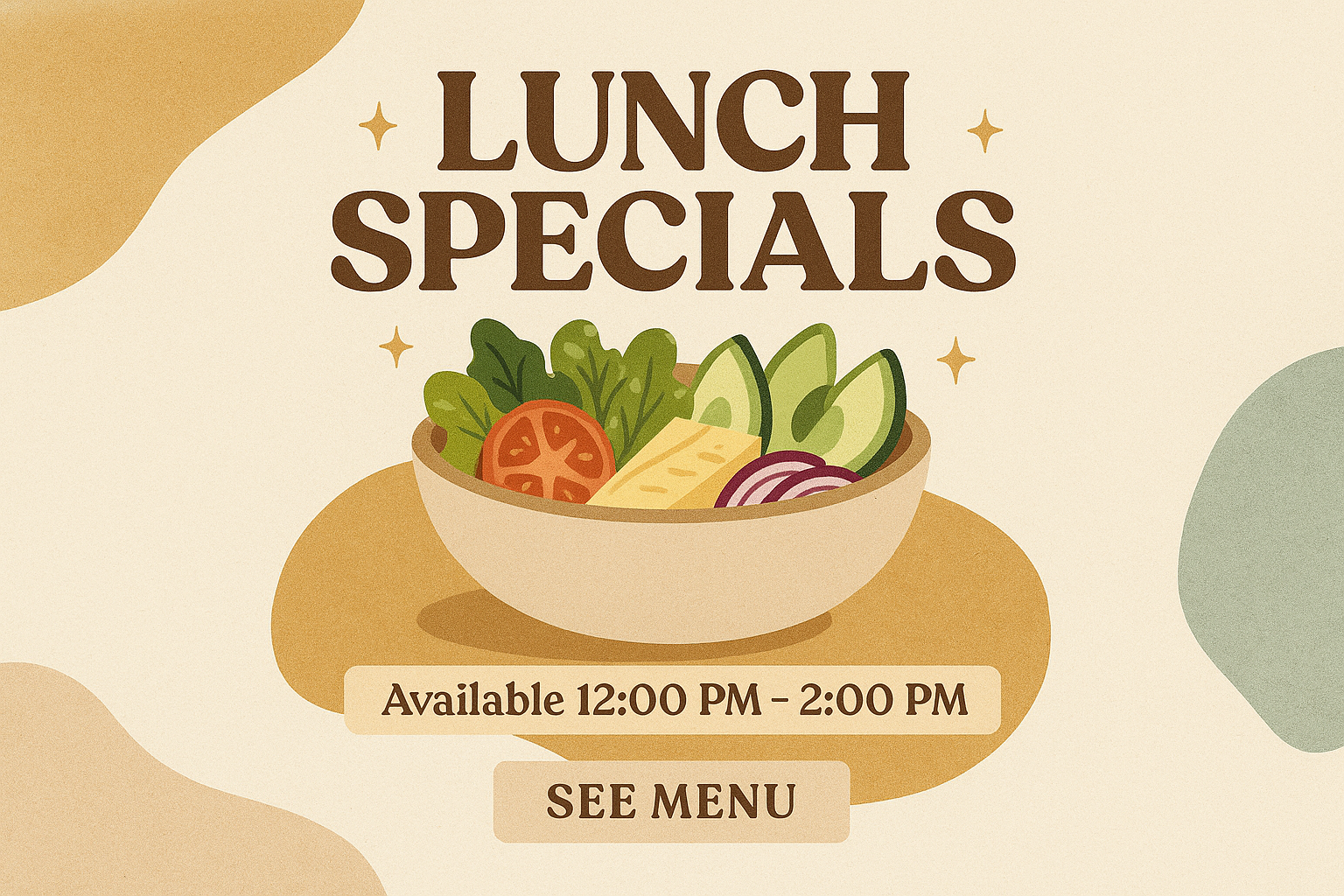 This image features a boho-style lunch specials menu with a bowl of fresh ingredients. The design includes a vibrant header and a clear call-to-action button, all set against a minimal background.